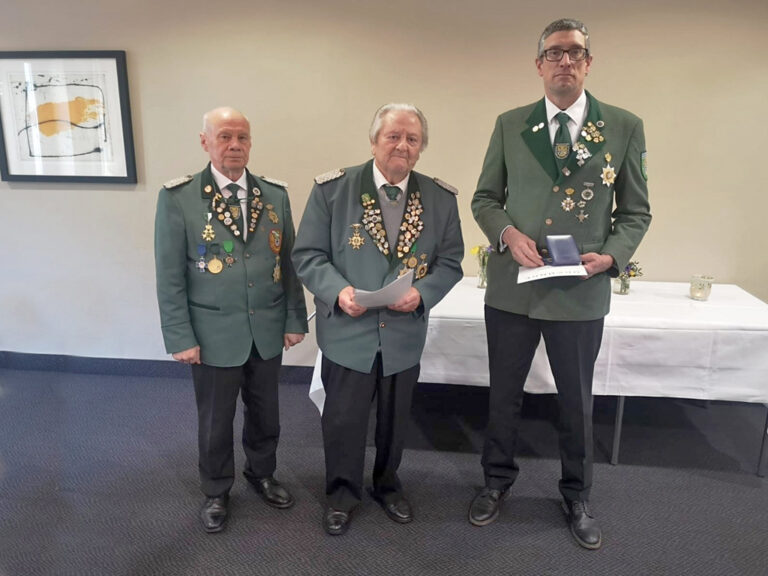Auszeichnung für verdiente Mitglieder: André Scherf (r.) erhielt die silberne Verdienstspange des RSB – Alex Breiden (m.) wurde mit der Sebastianus Nadel des DSB-Präsidenten für sein Lebenswerk geehrt.