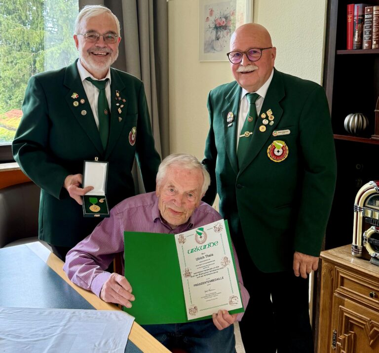 Am 10. Juli 2025 überbrachten der Vorsitzende des Schützenbezirks 13 Altenkirchen – Oberwesterwald, Karl-Heinz Pitton, und der Präsident des Rheinischen Schützenbundes, Jürgen Treppmann, dem Schützenbruder Ulrich Theis eine besondere Ehrung ins Marienhaus Altenzentrum St. Josef in Betzdorf.