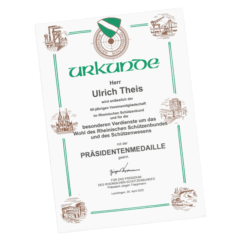 Eine der höchsten Auszeichnungen im Rheinischen Schützenbund wurde Ulrich Theis mit der Präsidentenmedaille samt Urkunde zuteil.