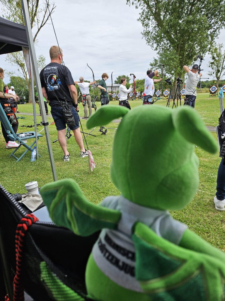 So ein Schusszettel ist schon spannend. Man darf weder Handy, noch Taschenrechner benutzen. Ich beobachte fasziniert auch die anderen Schützen. Bögen in allen Farben und Formen. Oft sind die Köcher farblich auf den Bogen abgestimmt. Die Zeit vergeht rasend schnell und der erste Durchgang ist beendet. Wir machen Pause. Ich darf etwas Obst naschen und Sprudelwasser schlürfen. Gemeinsam gehen wir ein bisschen über den Platz. Es ist angenehm warm, aber nicht zu heiß. Inzwischen hängen schon die ersten Ergebniszettel und Sandy belegt den ersten Platz mit einem Zwischenstand von 333 Ringen.