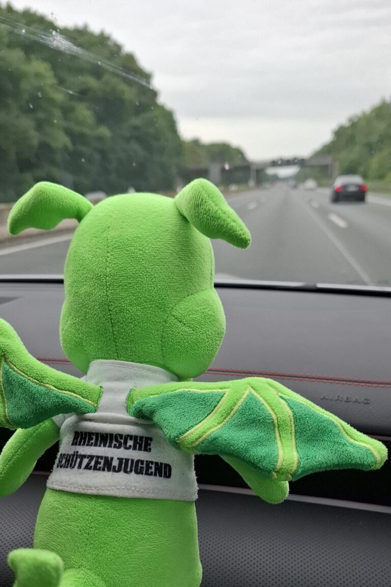 Die Fahrt war echt spannend. Ich durfte vorne bei Sandy mitfahren und hatte einen prima Ausblick. Als wir ankamen, nahm mich Sandy auf den Arm und ich machte es mir gemütlich, schließlich musste ich mir erstmal alles in Ruhe anschauen. Als erstes ging es mit allen Sachen zur Startnummer. Dort stellten wir dann erstmal alles ab. Weiter geht’s zur Anmeldung. Bescheid geben, dass wir da sind. Viele Schützenkameraden haben sich gefreut mich zu sehen. Ich wusste ja, dass ich bekannt bin, aber so bekannt….