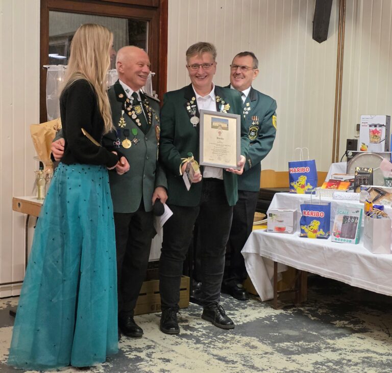 Für einen weiteren Höhepunkt sorgte die erste Tombola-Ziehung, bei der „Loreley“ Selina Ostmann als charmante Glücksfee zahlreiche Gewinner glücklich machte. Anschließend zeichnete Bezirksvorsitzender Wolfgang Hartwig gemeinsam mit Selina Ostmann und Bezirksgeschäftsführer Josef Rodenbusch Hans-Jürgen Herth (St. Seb. SG Urbar) mit der Ehrenmedaille des Bezirks in Gold aus – eine Würdigung für seine langjährige Tätigkeit als Ligaobmann des Schützenkreises 111 Koblenz.
